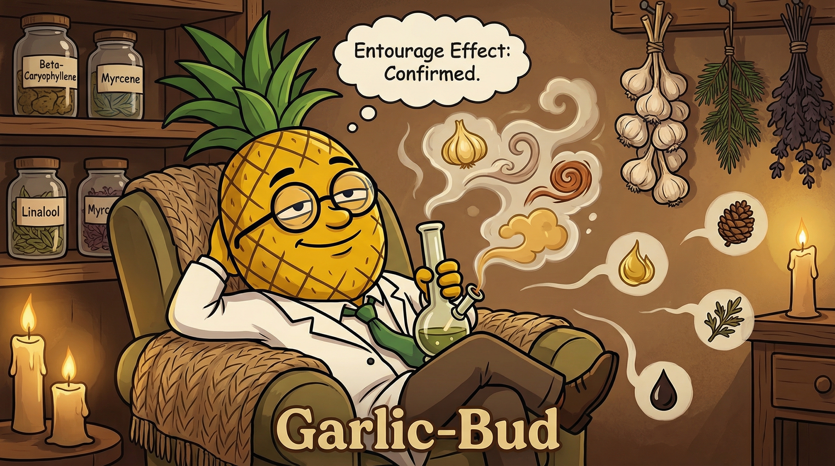 Okay, so I just took a hit of Garlic Bud and I want to be very precise about what's happening right now — because this is scientifically fascinating. Within about ten minutes, there was this warm cerebral expansion, like someone turned up the ambient light in my brain by about 30%. Not racey at all — it's a smooth, confident euphoria. Limonene doing its elegant work.